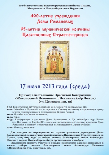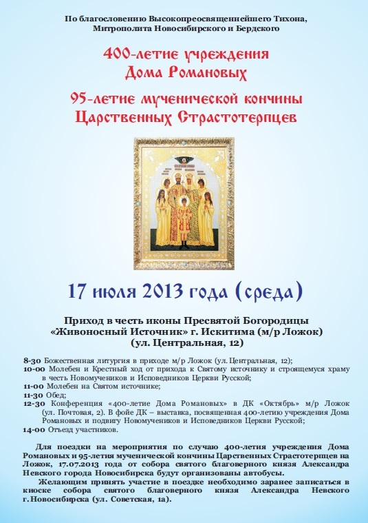 Для поездки на мероприятия по случаю 400-летия учреждения Дома Романовых и 95-летия мученической кончины Царственных Страстотерпцев на Ложок 17.07.2013 года от собора святого благоверного князя Александра Невского города Новосибирска будут организованы автобусы.